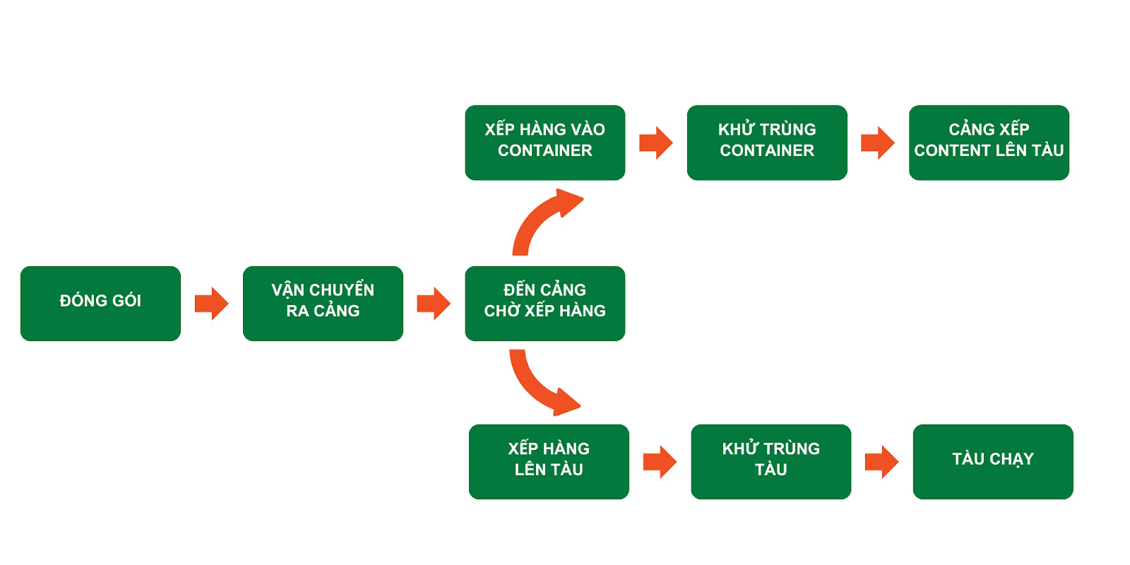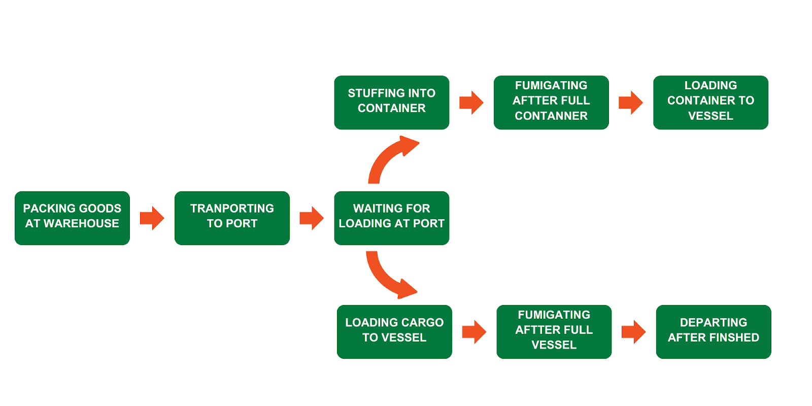 Nhà máy & Quy trìnhQuy trình xuất khẩu Posted on 14/06/202414/06/2024 by admin 1. Đóng gói/ Packing goods at warehouse 2. Vận chuyển ra cảng/ Transporting to port 3. Đến cảng và chờ xếp hàng/ Waiting for loading at port 4.1 Vận chuyển bằng container/ Shipped by container 4.1.1. Xếp vào container/ Stuffing into container 4.1.2 Khử trùng container/ Fumigating after full container 4.1.3. Cảng xếp container lên tàu đã book/ Loading container to vesse 4.2 Vận chuyển bằng tàu/ Shipped by bulk vessel 4.2.1. Xếp hàng lên tàu/ Loading cargo to vessel 4.2.2. Khử trùng tàu/ Fumigating after full vessel 4.2.3. Tàu chạy/ Departing after finished Quy trình sản xuất Chứng chỉ chất lượng